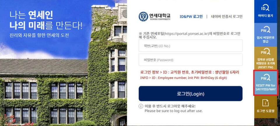: If you enter the wrong password multiple times, your account will be locked. Click the [RESET PW for SAY/YISS/WAY] button on the Yonsei Portal’s log-in page to reset your password.